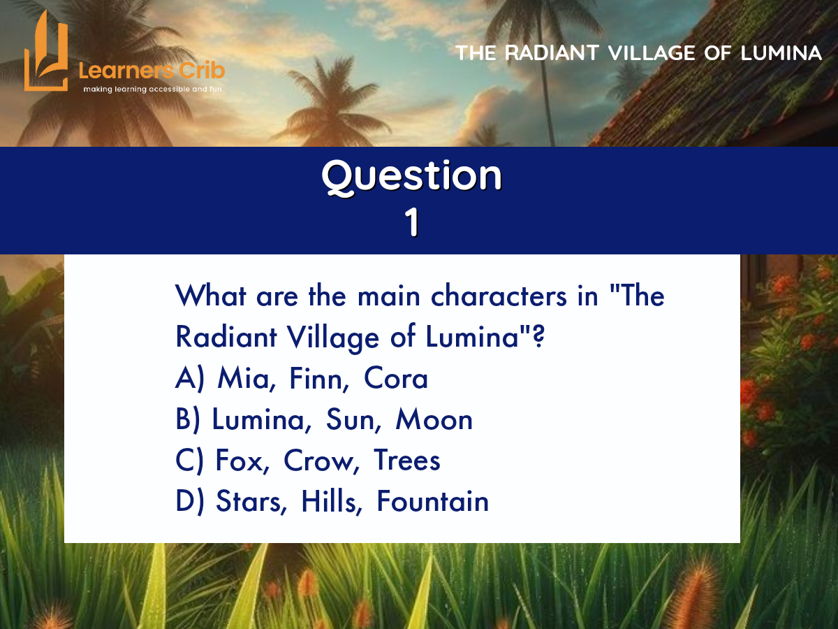 As Mia journeyed through the lush forests and crossed the glistening streams that surrounded Lumina, she encountered many trials. Along the way, she met a mischievous fox named Finn who tried to lure her off the path with cunning tricks, and a sly crow named Cora who tempted her with promises of treasure hidden in the shadows.